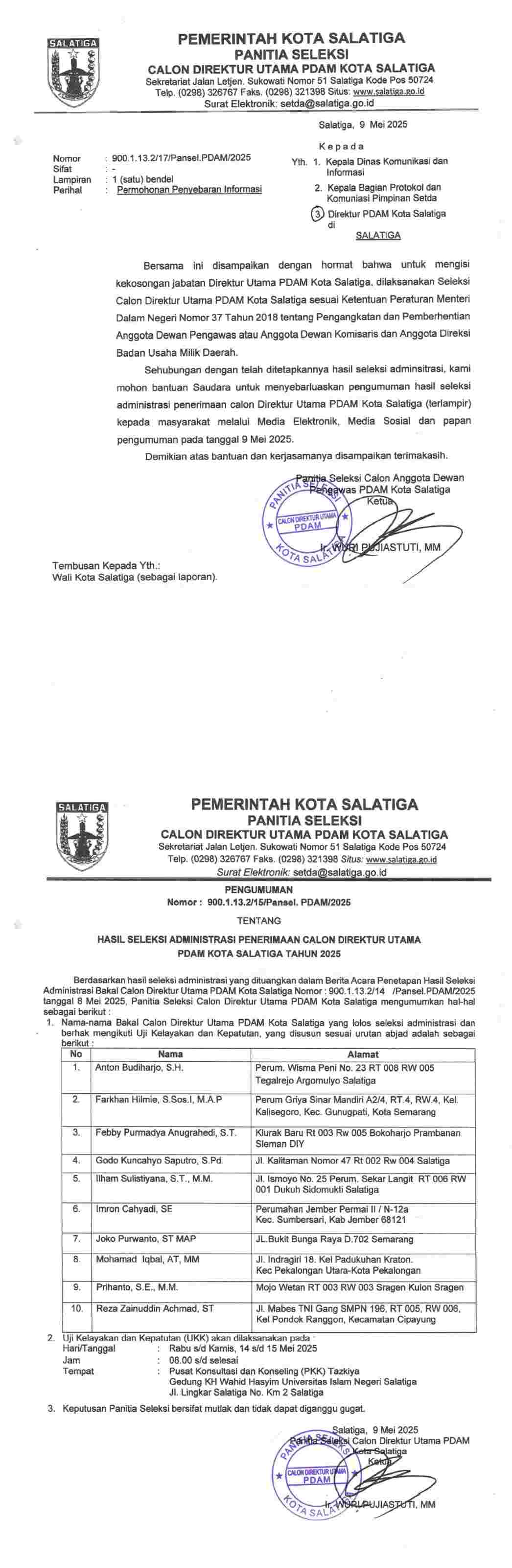 Pengumuman Hasil Seleksi Administrasi Calon Direktur Utama PDAM Kota Salatiga 2025