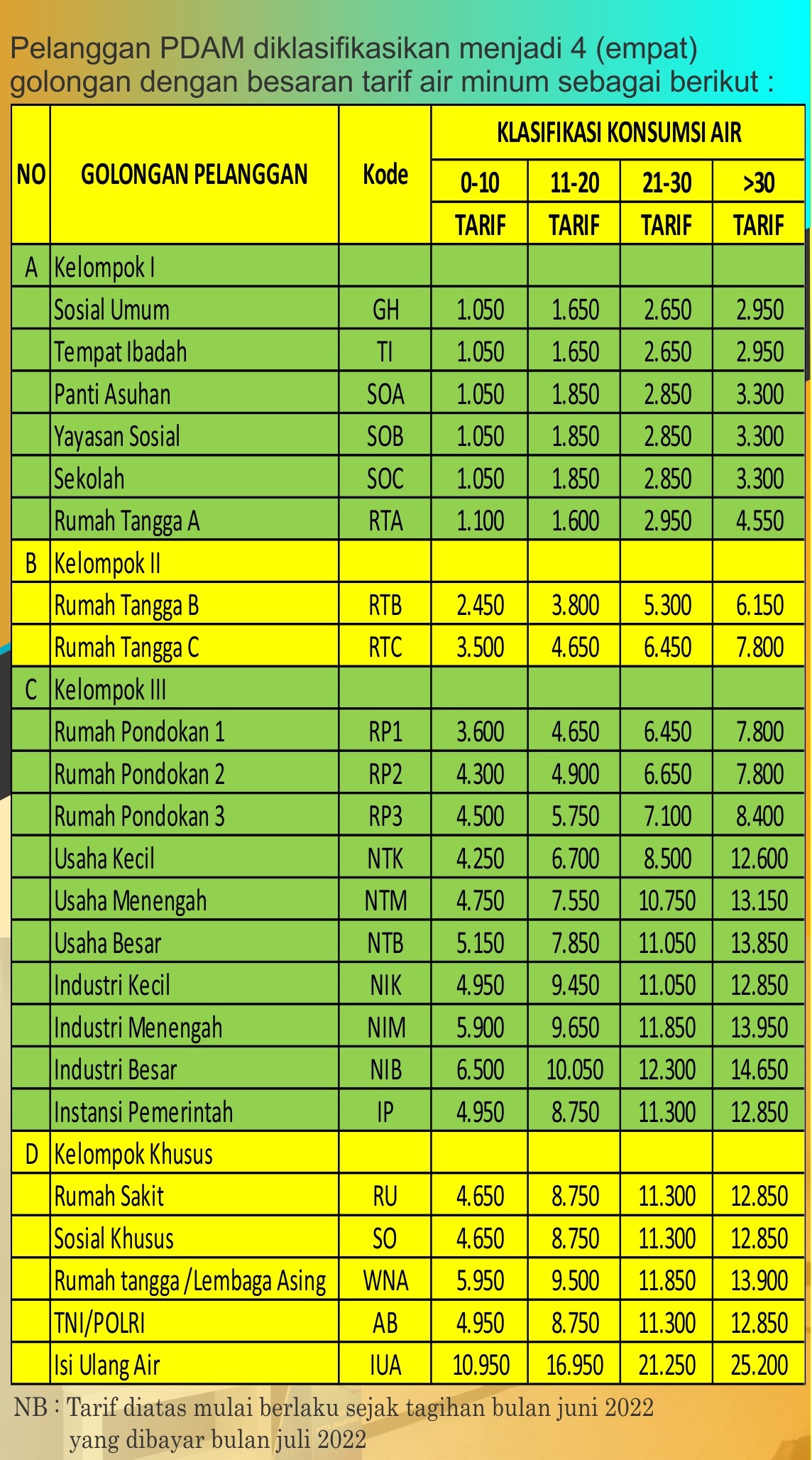 Pelanggan PDAM diklasifikasikan menjadi 7 (tujuh) golongan, dengan besaran tarif air minum sebagai berikut :